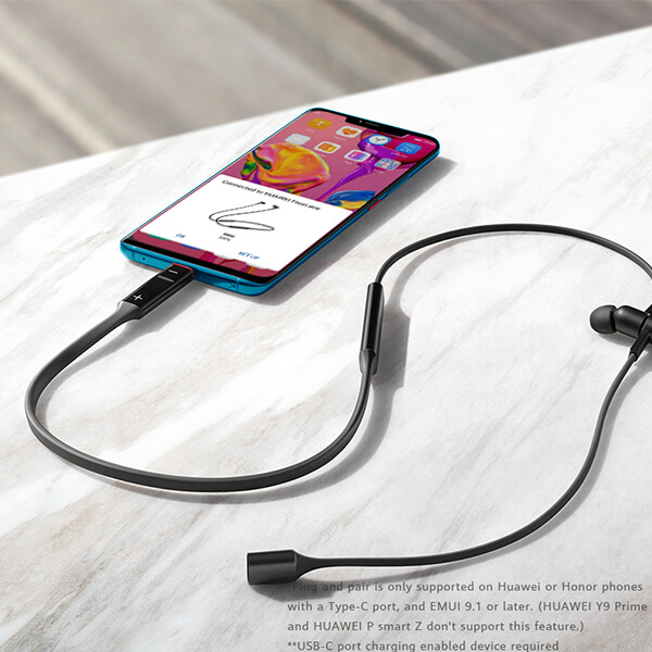 Built-in USB Type-C plug with self-developed HUAWEI HiPair technology once plugged in the phone, the HUAWEI FreeLace can be paired at once and is ready to be reverse charged by the phone in an emergency during workouts.