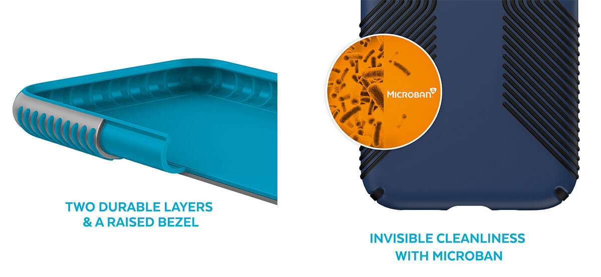 A protective and slim case that offers raised rubber ridges for a no-slip grip, Microban antimicrobial product protection, and 13-foot drop protection