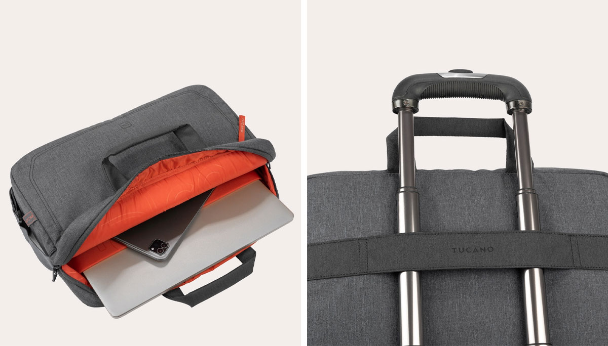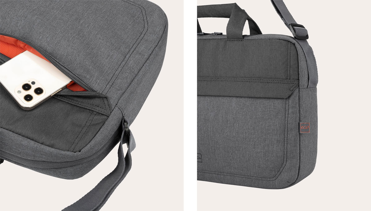 Bag for 15.6” laptops and 16” MacBook Pro made with mélange-look fabric produced from recycled plastic. Featuring a roomy central compartment, the Hop bag is equipped with an internal pocket for laptops and an external front pocket for accessories.The back has a convenient trolley strap.